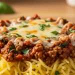 A delicious, healthy dish that’s a low-carb pasta alternative, combining spaghetti squash with cheesy goodness and hearty meat sauce.