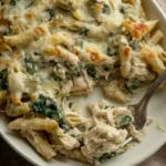 A comforting and hearty chicken pasta bake that combines tender pasta, juicy chicken, and creamy cheeses, perfect for family dinners or potlucks.
