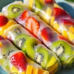 Refreshing and colorful fruit spring rolls filled with fresh fruits and mint, perfect for warm days or as a light snack.