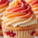 Once the cupcakes are cool, use a piping bag or a small knife to fill the center of each cupcake with strawberry jam. For the frosting, beat the unsalted butter until creamy, then gradually add powdered sugar. Mix in the vanilla and heavy cream until the frosting is smooth and fluffy. Divide the frosting into three bowls: leave one white, mix one with mango purée for a beautiful yellow-orange hue, and mix the last one with strawberry purée for a pink-red tone. Using a piping bag, fill it with the colors side-by-side to create a beautiful “sunset swirl” effect while frosting the cupcakes. Optional: garnish with a small slice of fresh strawberry or mango for that extra touch of elegance.