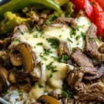 Delicious Philly Cheesesteak Bowls loaded with tender steak, sautéed peppers, onions, and gooey cheese, perfect for a low-carb dinner.