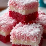 While the cake cools, prepare the coconut filling. In a bowl, mix the shredded coconut, powdered sugar, milk, and vanilla extract until fully combined. Spread this coconut mixture over the cooled cake layer. In a separate bowl, whip the topping with pink food coloring until it reaches a light pink color, then spread it over the coconut layer. Chill in the fridge for at least 2 hours to set before cutting into bars and serving.