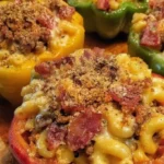 A delicious combination of cheesy mac and cheese, savory bacon, and ground beef, all stuffed in colorful bell peppers. Perfect for cookouts and gatherings!