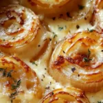 A delicious and comforting dish featuring sweet onions baked with a melty cheesy topping.